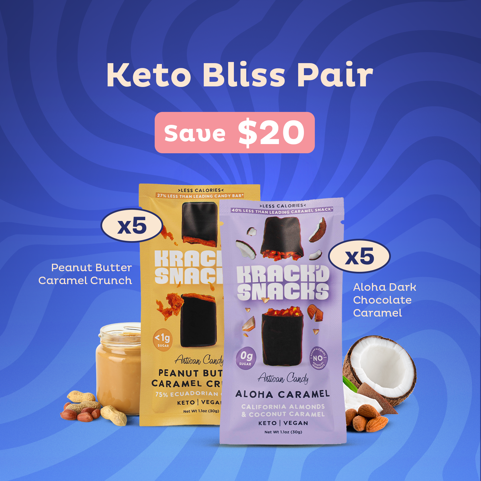 Indulge in the delightful Keto Bliss Pair, designed for those who crave an assortment of rich and satisfying flavors. This exclusive bundle includes: 5 Aloha Caramel bars and 5 Peanut Butter Caramel Crunch bars, available in three delectable Flavors for you to choose from: Dark Chocolate, White Chocolate, and Birthday Cake. Whether you're a fan of classic dark chocolate, creamy white chocolate, or festive birthday cake, this bundle has something for everyone.
