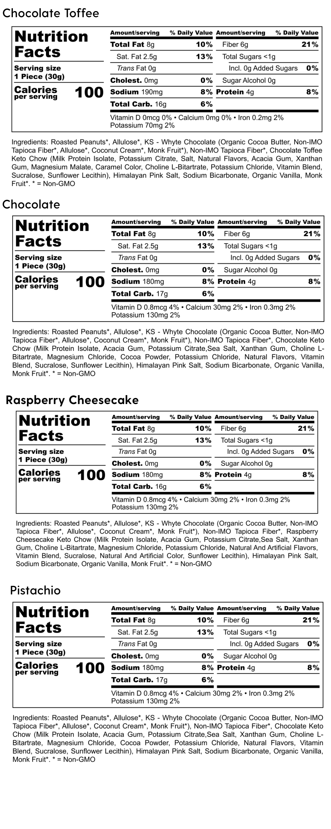 - Our products are naturally sweetened with high quality Allulose and Monk Fruit. Any of our confections with white chocolate do contain small amounts of Erythritol, which is a sugar alcohol.
